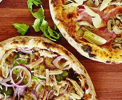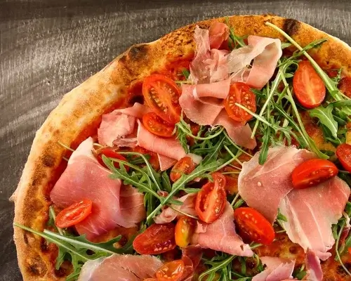 Tomato Sauce, Prosciutto, Cherry Tomato, Rocket and Mozzarella Cheese.