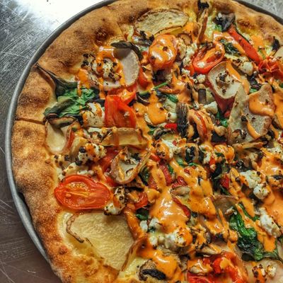 Tomato Sauce, Capsicum, Cherry Tomato, Mushrooms, Roasted Potatoes, Spinach, Feta Cheese, Mozzarella Cheese, Tasty Cheese, Fresh Chilli and Homemade Hot Sauce.