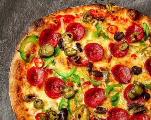 Tomato Sauce, Pepperoni, Capsicum, Jalapenos, Olives, Mozzarella Cheese and Chilli Flakes.