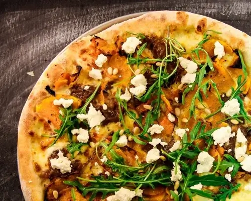 Red Onion, Pumpkin, Rocket, Feta Cheese, Mozzarella Cheese and Pine Nuts.