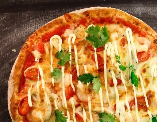 Tomato Sauce, Cherry Tomato, Mozzarella Cheese, Calamari, Prawn, Coriander and Garlic Aioli Swirl.