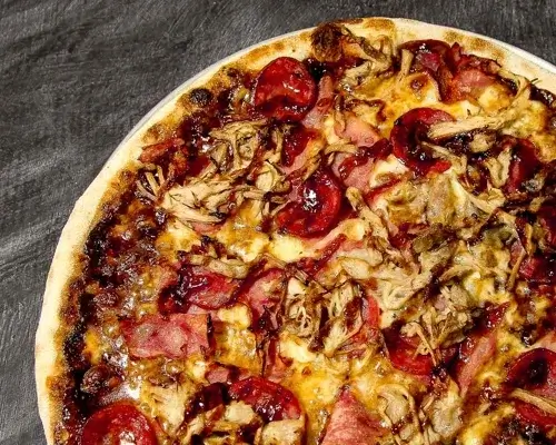 BBQ Sauce, Ham, Pepperoni, Pulled Pork, Mozzarella Cheese and Tasty Cheese.