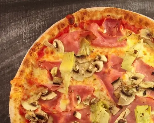 Tomato Sauce, Ham, Pepperoni, Artichokes, Mushrooms and Mozzarella Cheese.