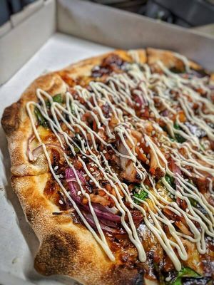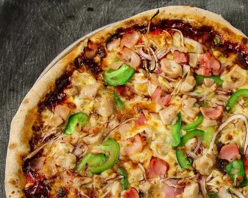 BBQ Sauce, Bacon, Chicken, Capsicum, Red Onion and Mozzarella Cheese.