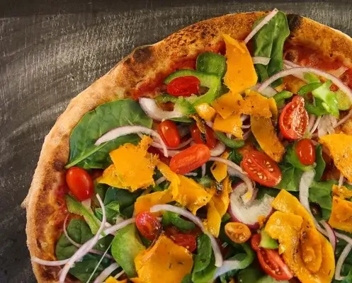 Tomato Sauce, Capsicum, Red Onion, Pumpkin, Chopped Tomato, Spinach and Mozzarella Cheese.