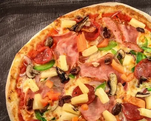 Tomato Sauce, Bacon, Ham, Pepperoni, Capsicum, Chopped Tomato, Mushrooms, Olives, Pineapple, Red Onion and Mozzarella Cheese.